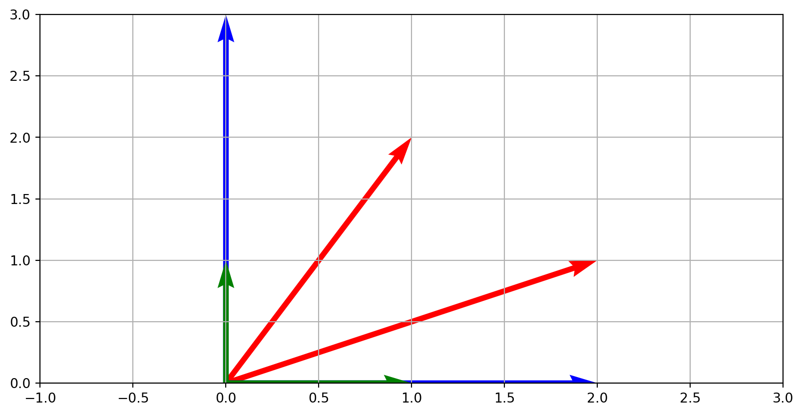 plt.quiver(*origin, V[:,0], V[:,1], angles='xy', scale_units='xy', scale=1, color=['red', 'red', 'blue','blue', 'green', 'green'])