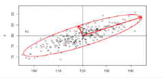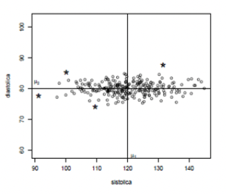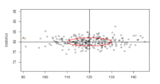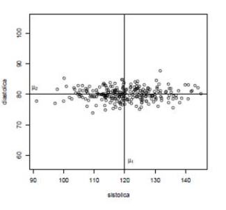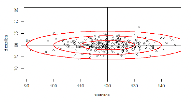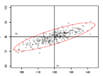 \[ d(y, \mu) = \sqrt{\left(\frac{y_1-120}{10}\right)^2 + \left(\frac{y_2-80}{2}\right)^2} =1 \]