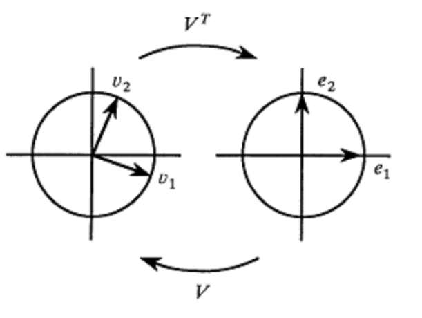 \(V\) (\(V^\top\)) é uma matriz ortogonal. Produto de um vetor por uma matriz ortogonal pode ser vista como rotação ou reflexão. Lembrando que \(V^\top\) é a inversa de \(V\)