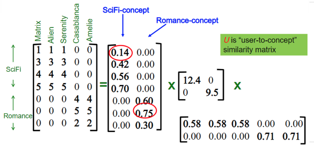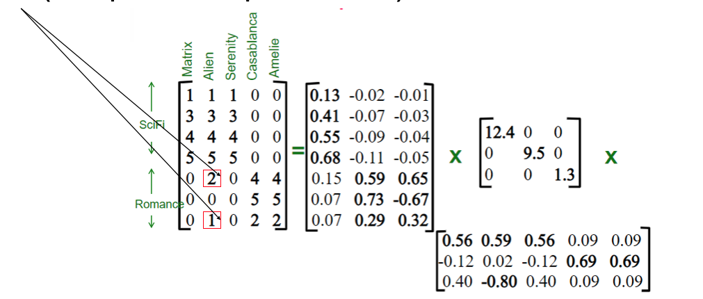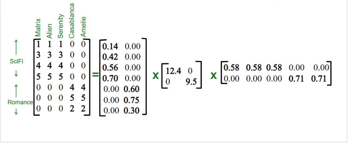 \[\underbrace{A}_{m\times n} = \underbrace{U}_{m\times m} \underbrace{\Sigma}_{m\times n}\underbrace{V^\top}_{n\times n}\]