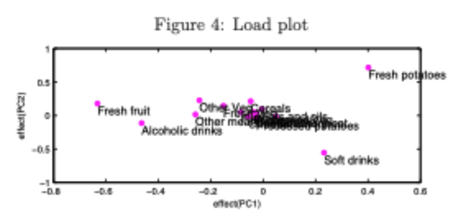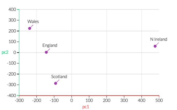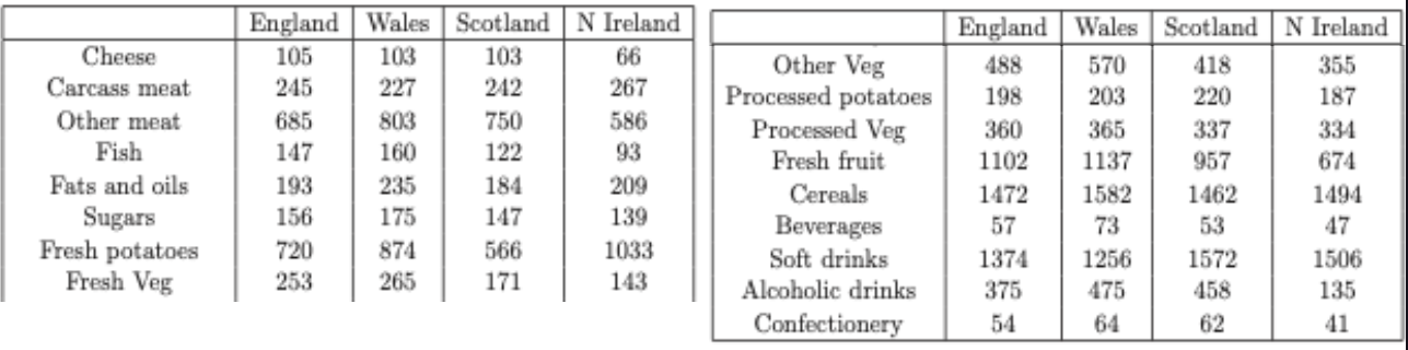 DEFRA (Department for Environment, Food and Rural Affairs) data: consumo (g/pessoa/semana), 17 tipos de comida, quatro países Reino Unido em 1997.