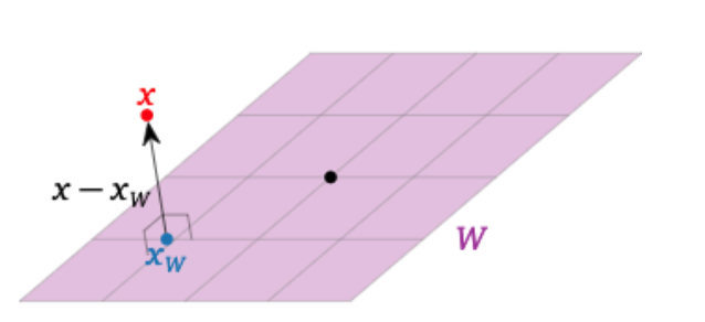 Onde \(x_W\) é o vetor mais próximo a \(x\) em \(W\) e \(x_{W\perp}\) está em \(W^\perp\)