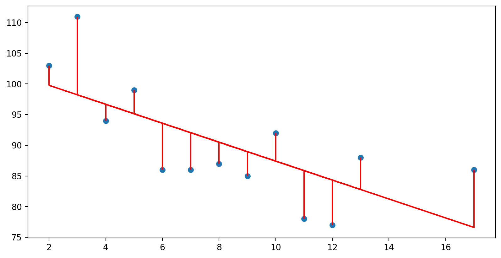 plt.vlines(x[i], y[i], predicted[i], color= "red" )